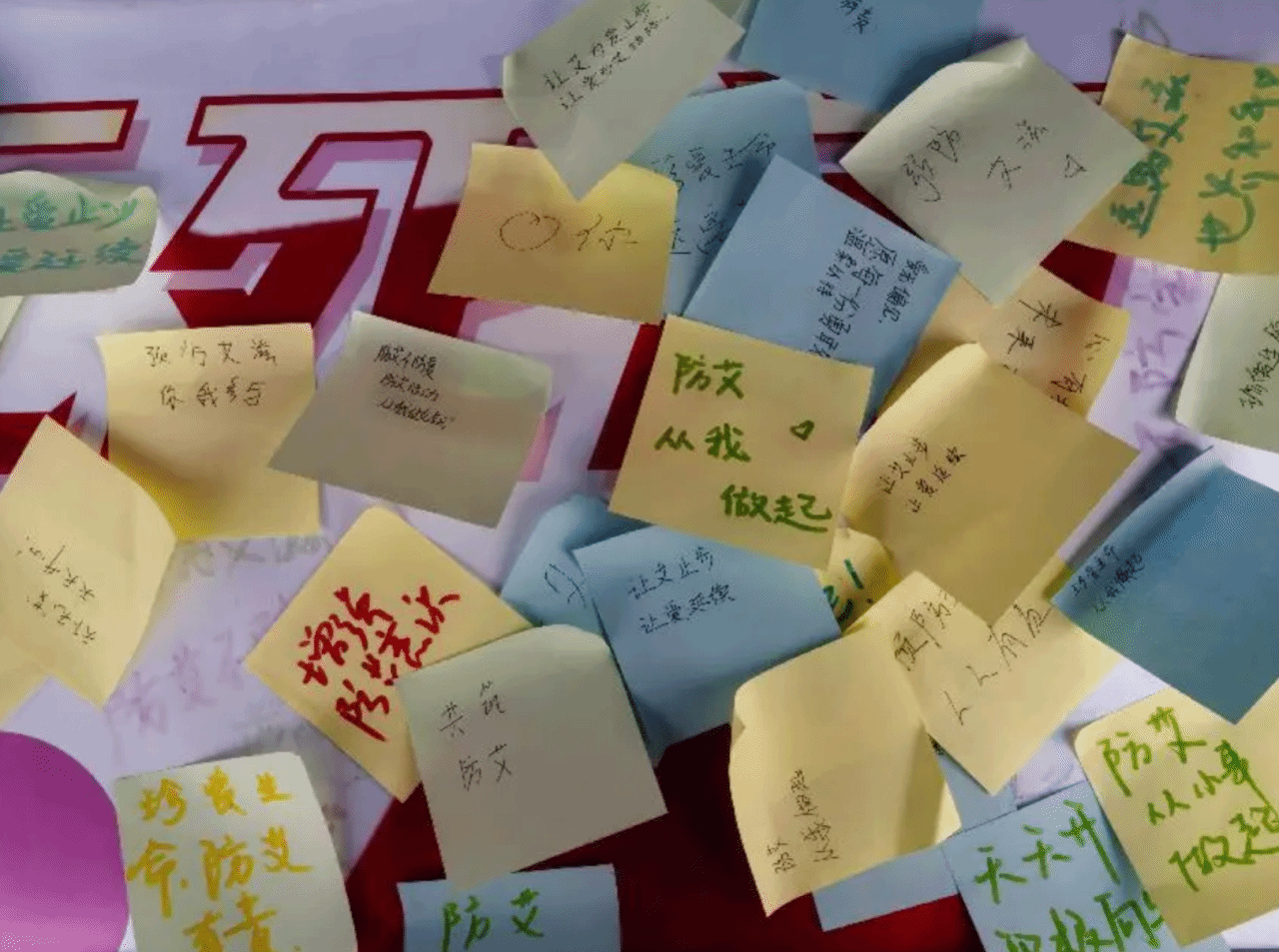 书写者们有的蹲下执笔,有的俯身书写,他们都用彩笔写下了“防艾从我做起”“愿所有防艾的善意都能抵达人心”等许许多多温柔的话语,当活动结束时,桌子上贴满了五颜六色的彩色便利贴,上面写满了同学们对艾滋病患者想说的话语和对“天下无艾”的期望。那一张张小小的便利贴,像一簇簇温暖的火苗,把理解与善意积攒在了一起,也让防艾的声音传的更久。