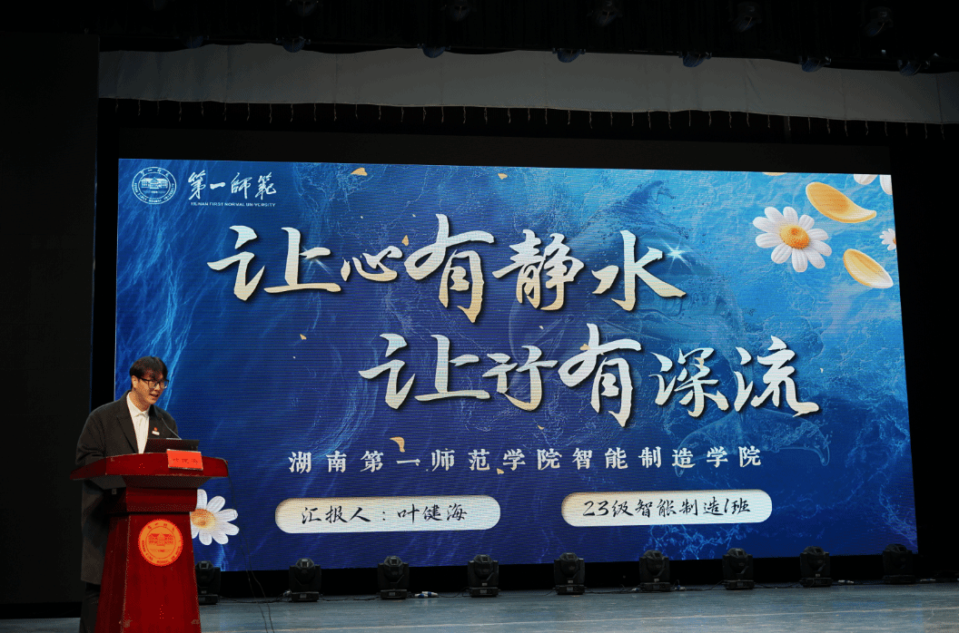 2023 级员工代表叶健海作学习与发展经验分享。他谈到,优异的学业成绩源于日复一日的坚持与高效的学习方法,同时,不局限于课堂,而是通过积极参与各类活动主动拓宽视野。他鼓励同学们既要脚踏实地,也要仰望星空,在实践中不断绘制属于自己的发展蓝图。